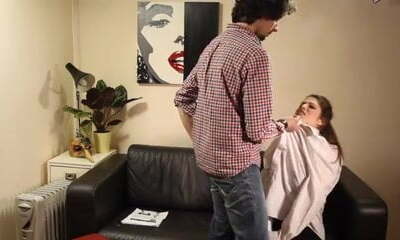 Mischievous Allison Moore blows her manager and gets fucked on the red sofa