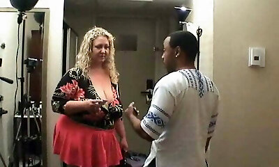 Fat platinum-blonde with big saggy bumpers stumbles onto a BBC porn set